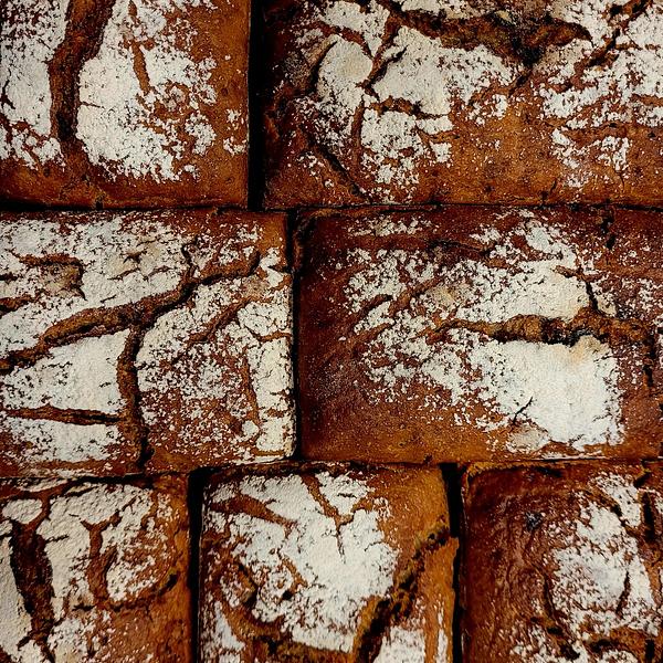 Mąka żytnia razowa, świeżo mielone ziarno żyta, mąka pszenna, zakwas żytni, sól Wymiennie: dynia, sezam, czarnuszka, słonecznik, kminek, mak, siemię lniane ok. 600g