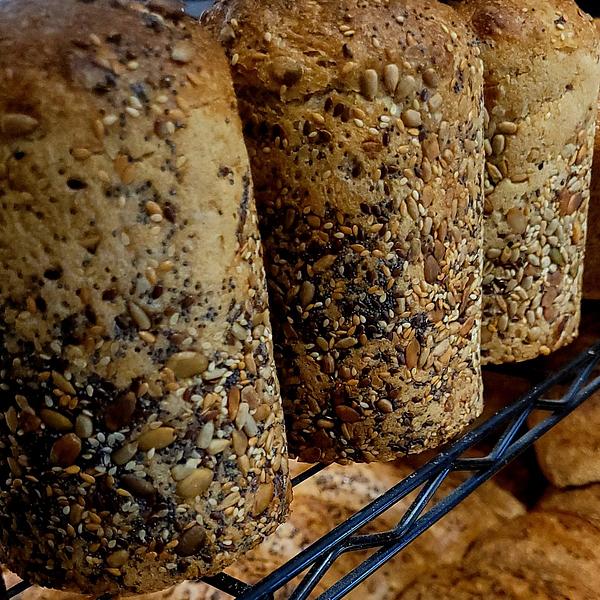Mąka żytnia razowa, świeżo mielone ziarno żyta, mąka pszenna, zakwas żytni, sól, ziarna: słonecznik, dynia, sezam biały, sezam czarny, siemię lniane, złoty len, czarnuszka ok. 600g