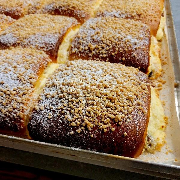 Mąka pszenna, jaja, masło, cukier brązowy, drożdże, twaróg, mąka ziemniaczana, ekstrakt waniliowy, rodzynki