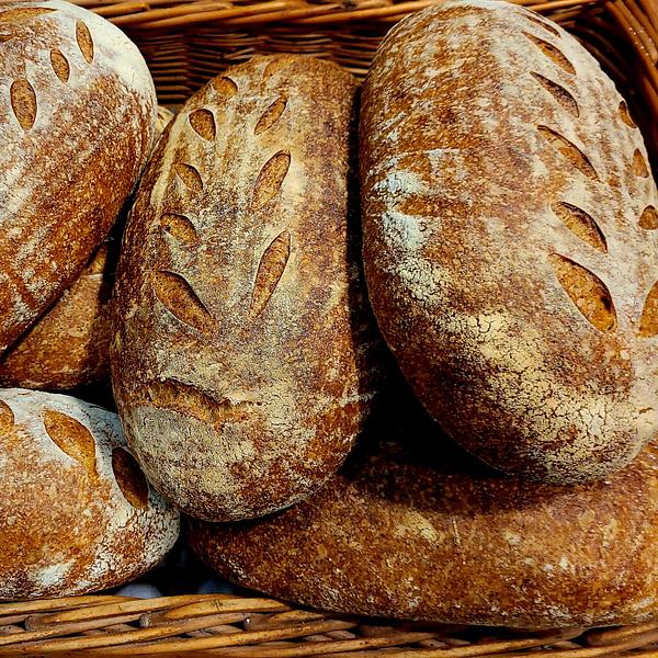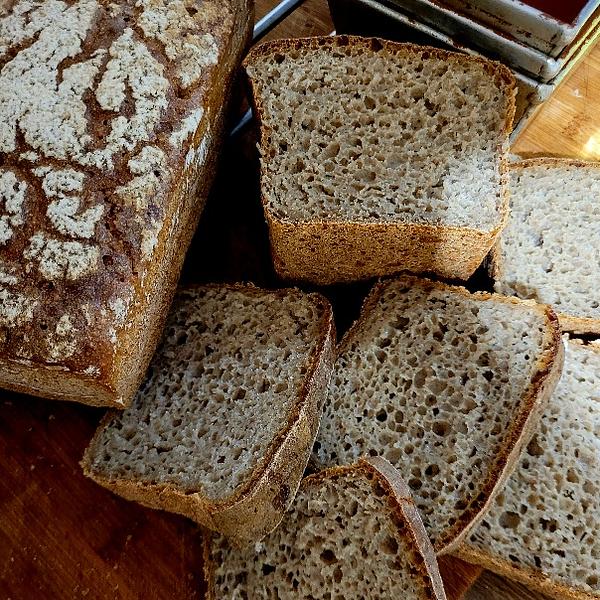 Mąka żytnia, mąka pszenna, mąka orkiszowa, graham, świeżo mielone ziarno żyta, zakwas żytni, sól. ok. 650g