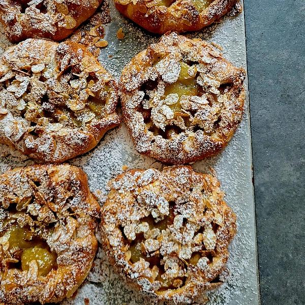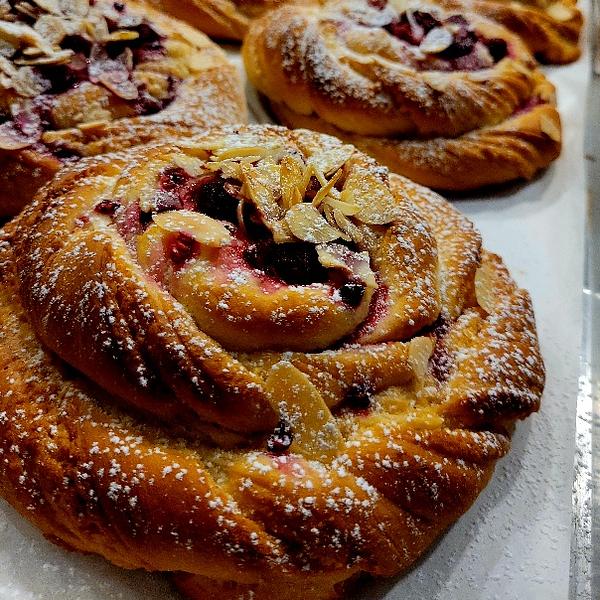Bułeczka maślana z kremem migdałowym i owocami składniki: mąką pszenna, masło, jaja, drożdże, cukier, migdały mleko, owoce